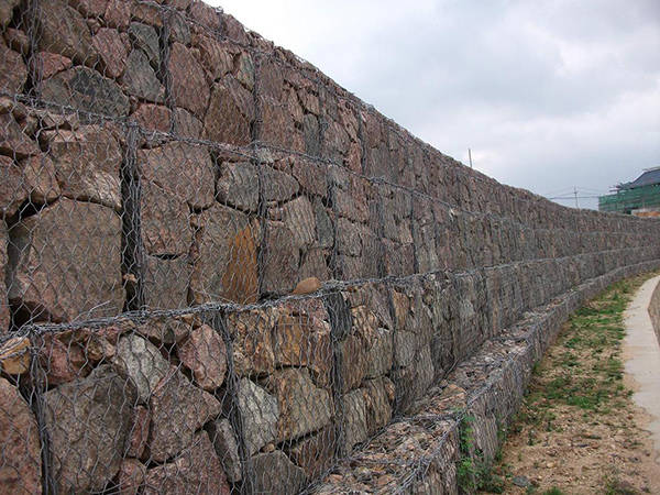 石籠網(wǎng)由高不腐蝕、高強度、具有延展性的低碳鋼絲或者包覆PVC的以上鋼絲使用機械編織而成,使用該網(wǎng)制作而成的箱型結(jié)構就是石籠。根據(jù)ASTM和EN標準,所使用的低碳鋼絲直徑根據(jù)工程設計要求而不同。一般介于2.0-4.0mm之間,石籠網(wǎng)鋼絲的抗拉強度不少于38kg/m2,金屬鍍層重量一般高于245g/m2,石籠網(wǎng)片的邊緣線直徑一般要大于網(wǎng)線直徑。其雙線絞合部分的長度不得小于50mm.以保證絞合部分鋼絲的金屬鍍層和PVC鍍層不受破壞。
